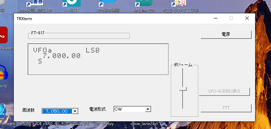 画面イメージを以下に示します。右上の電源ボタンを押すことにより、WiFiを通じてPOWER ONのコマンドが送られ、トランシーバの電源が入ります。電源オンでトランシーバから受信の音声が出ます。この音声をWiFIを通じて、PCのスピーカに出します。PTTオンボタンを押すと送信になり、PCのマイクの音声がWiFIを通じて送られ、TRXtermのSPRESENSE 拡張基板のHP端子からトランシーバに送られます。