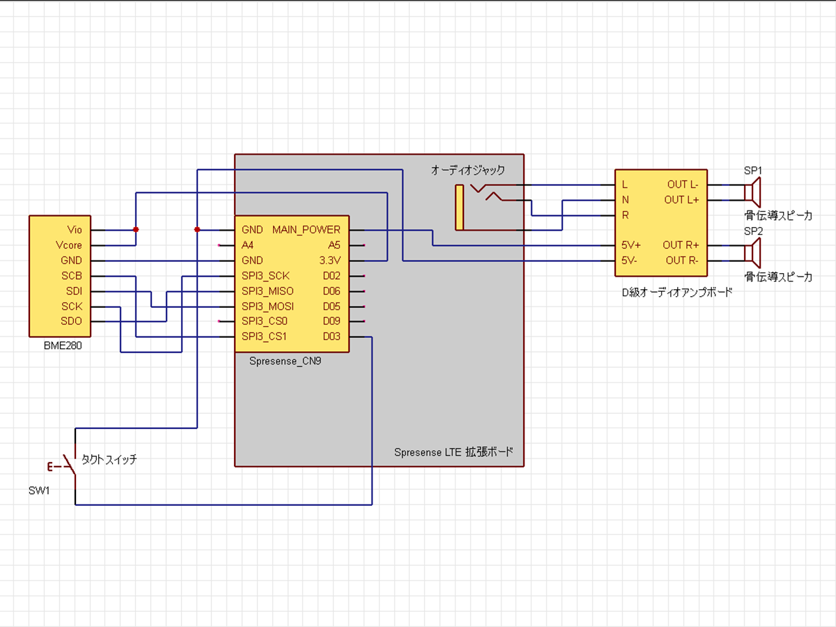 - LTE拡張ボードのオーディオ端子から、D級アンプボードを介して骨伝導スピーカに接続