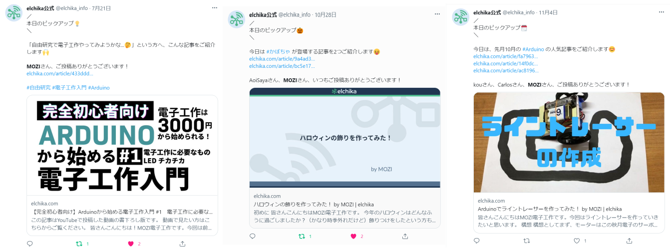 このelchikaというサイトには、公式のTwitterアカウント(@elchika_info)があります。このアカウントが定期的に「ピックアップ」と題してelchika内に投稿された記事を紹介しています。公式Twitterの活動が活発といいうのも魅力の一つですね。