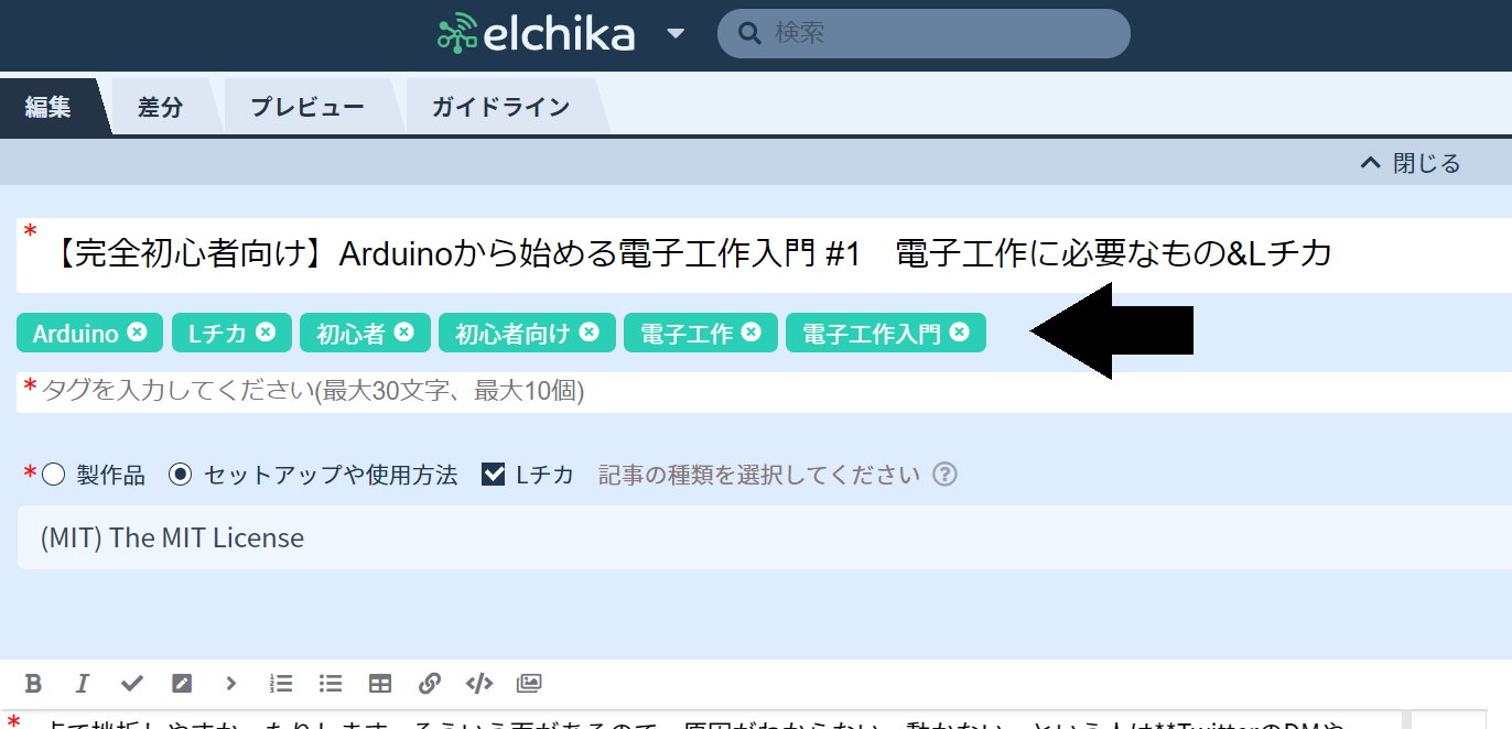 そして最近のアップデートで、記事内のコード(プログラム)などの使用時のライセンスを設定することができるようになりました。(具体的にはオープンソースライセンス、オープンハードウェアライセンス、クリエイティブ・コモンズ・ライセンスが設定できます。詳しくはelchikaのガイドラインを見ていただければ..)これで安心してelchika内の記事ににコードを投稿することができます。私は基本的に比較的自由に使えるライセンスのMITに設定しています。