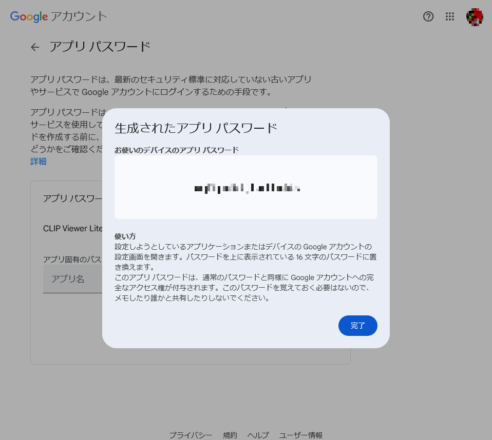 ↓パスワードが表示されます。これをプログラムにコピペします。