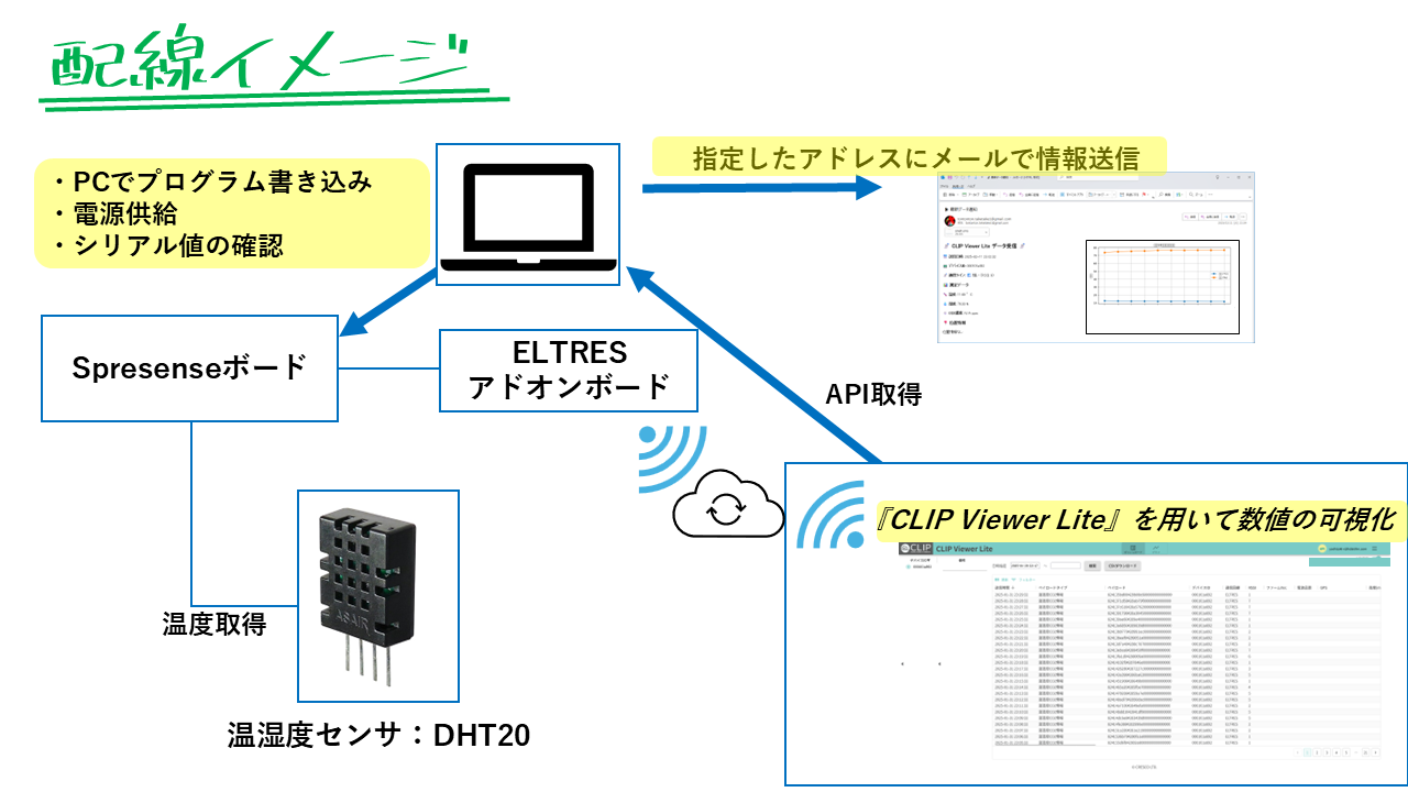 今回はSpresense と ELTRES を用いて温度、湿度を測定しクラウドに送信。併せてメールでも情報を共有するという事を行ってみました。