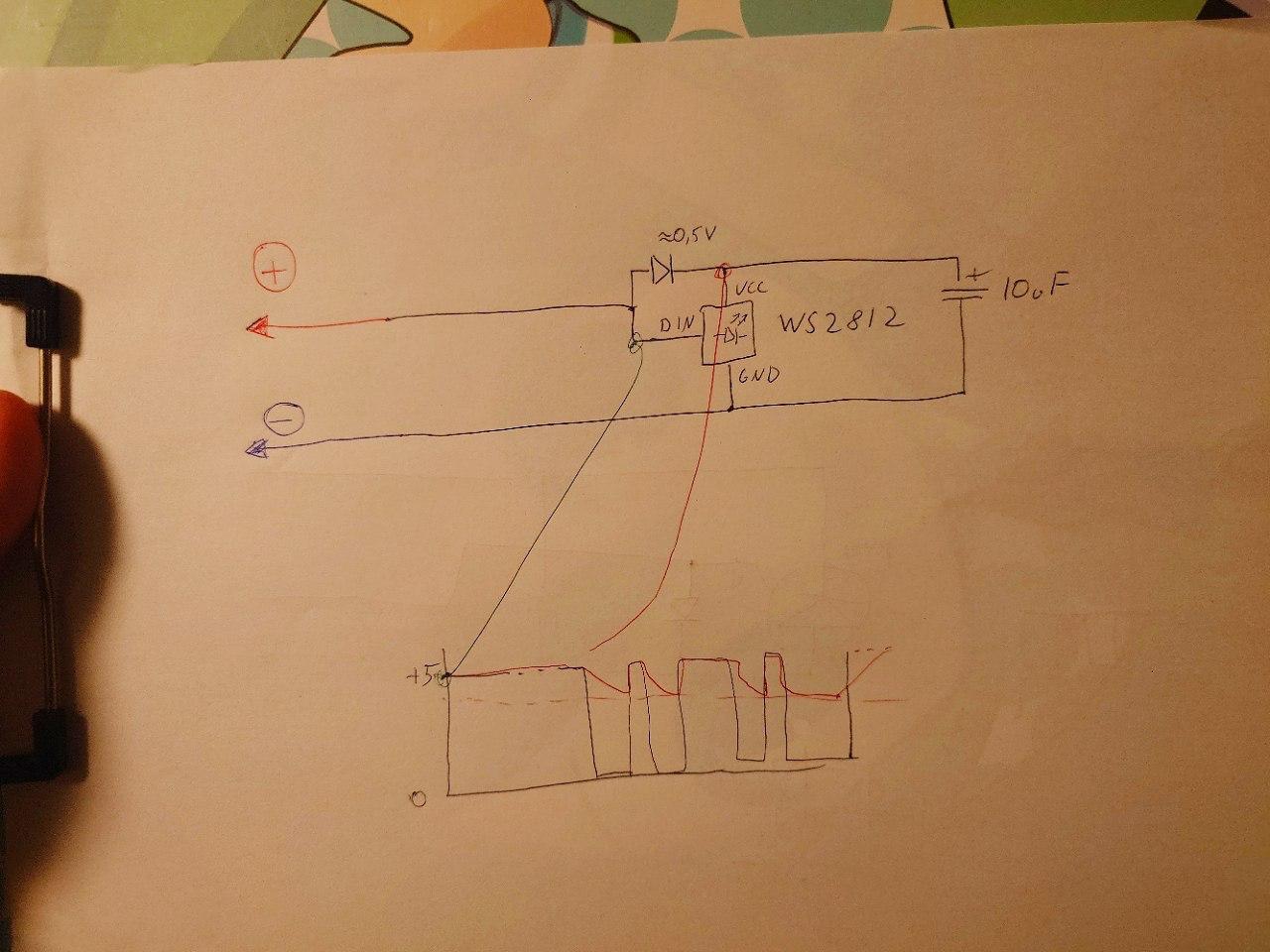 ということで、データバスの電流キャパが十分であれば、+に普通のWS2812制御信号を通信させたら動作しますね。