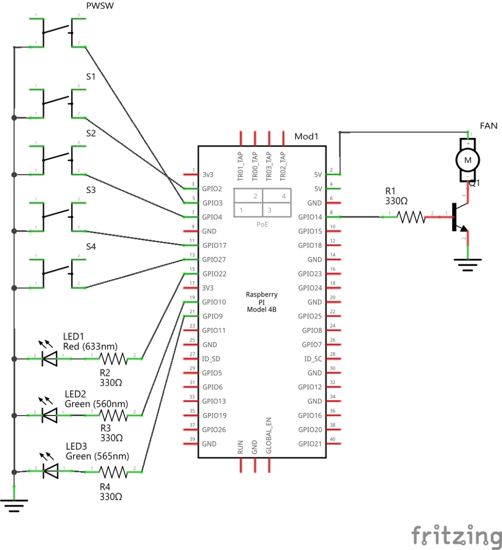 電源ON、OFFのスイッチとFAN制御のGPIOはディフォルトでGPIO3と14なので、そのまま接続。