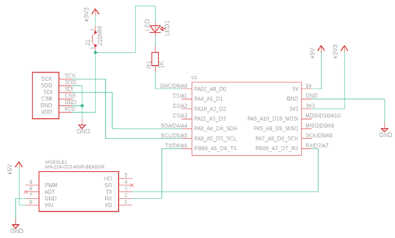 下の図は今回の回路図になります。BME280はI2CでMHZ-19CはUARTで通信を行い、データを取得しています。