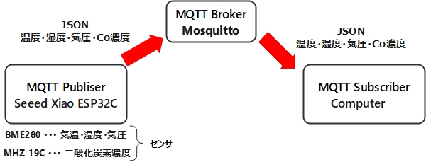 今回はマイコンにSeeed Xiao ESP32Cを使用しました。データの配信にはMQTTを使用して配信をしています。MQTTのBrokerには、Mosquittoを使用しています。Mosquittoは公開サーバを使用せず、ローカルでサーバを立ち上げテストをしています。Mosquittoのインストールや稼働についてはインターネットに情報がたくさんあるので調べてみてください。