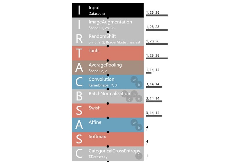Neural Network Consoleの構造自動探索機能を用いて学習を行ったところ、評価データにおける正解率は98.74%となっていました。