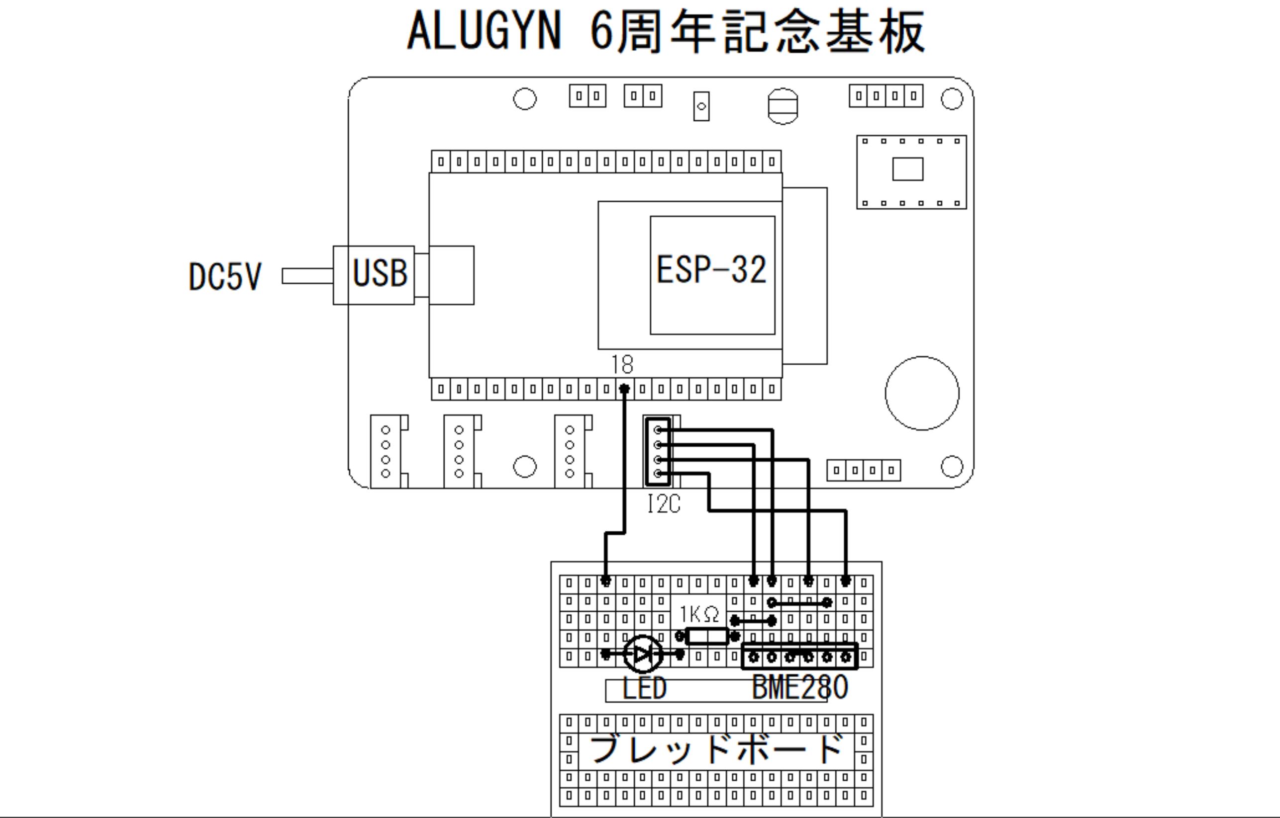 ①ALUGYN6th基板のI2CソケットにBME280センサーをつなぎ、USBソケットに5V電源をつなぎます。(バッテリーでも可能です。)
