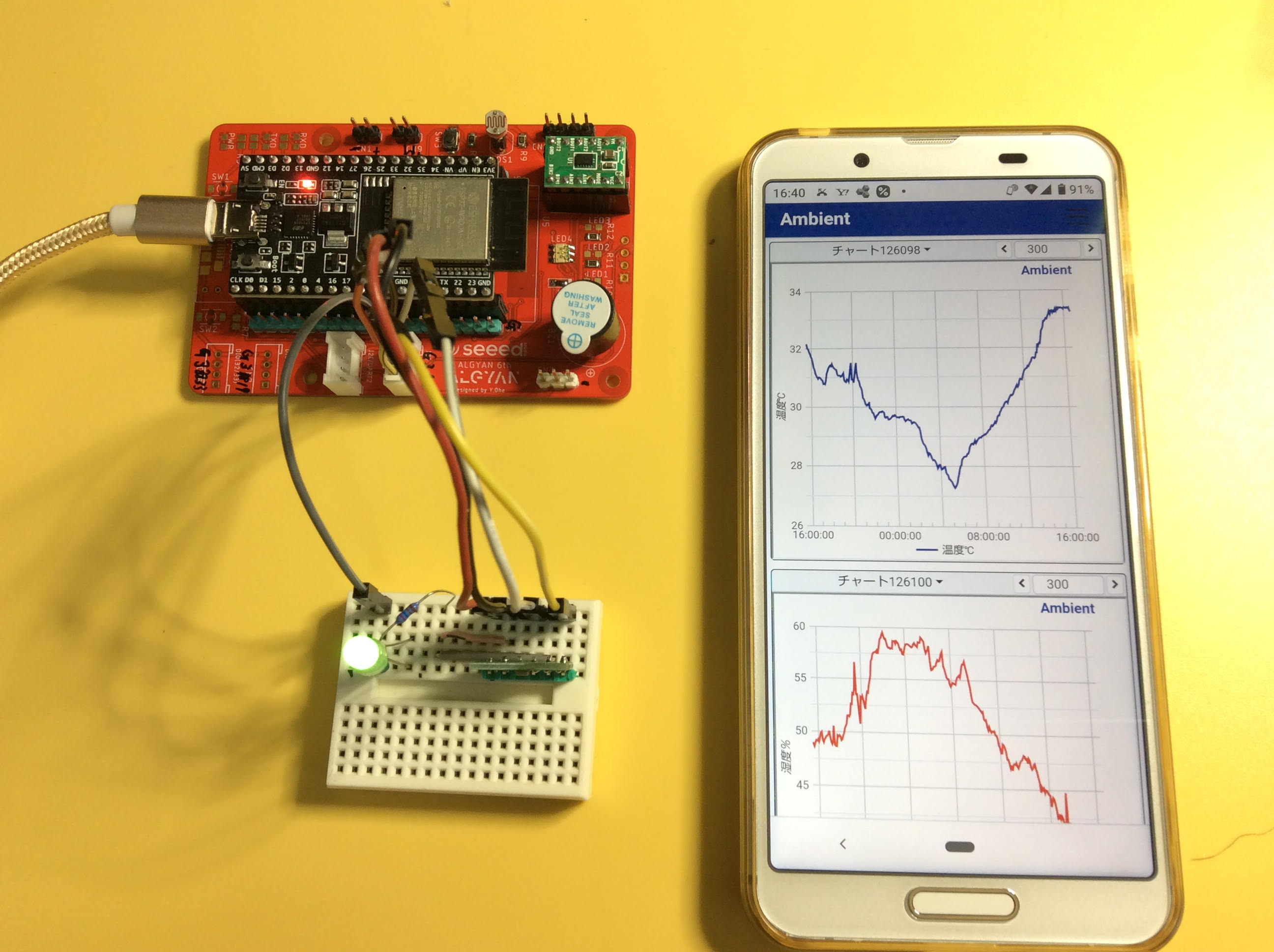 ALGYAN の6周年基板を使って使って、BME280のセンサーで気温、湿度、気圧を測定し、I2Cで接続し、Ambientでグラフ表示をしてみました。