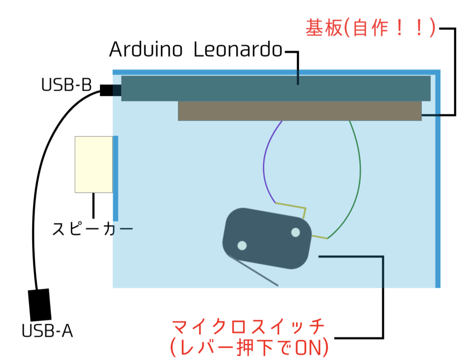 弊校には基板加工機があり、Eagleで作製した回路図を元に自作基板を作りました!配線自体は単純なので、一般のユニバーサル基板等でも十分です。 - マイクロスイッチ