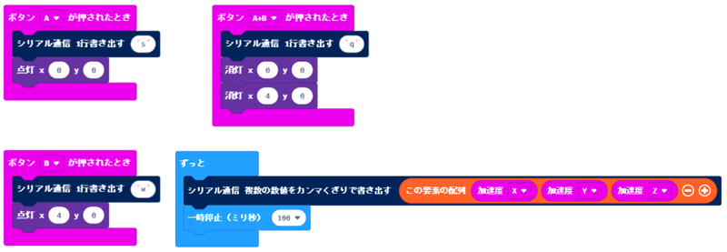 仕組みとしてはmicro:botの情報(ボタンと加速度)をシリアル通信でPCに送り