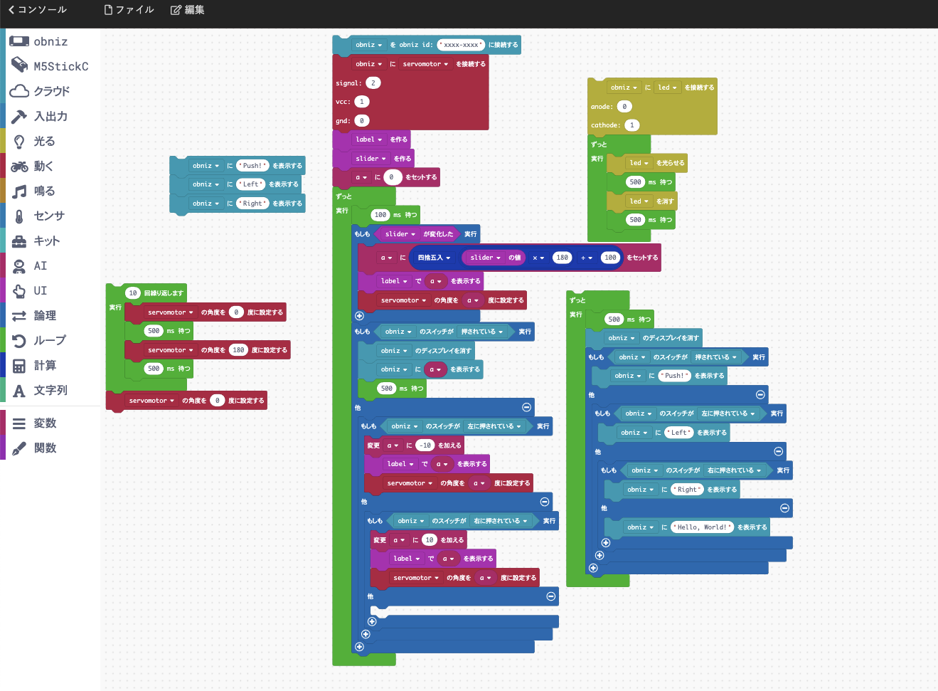 これ以外に obnizをよく知るために、用意されているブロックプログラミングでの開発でスライドバーのUIと手持ちのサーボを合わせてグイグイ動かしてみたり、 obniz.io.repeatWait でWS2812のLEDアニメーションを試みたりしました。とにかく気軽に色々試せるので今後もobnizで遊んでみたいと思っています。