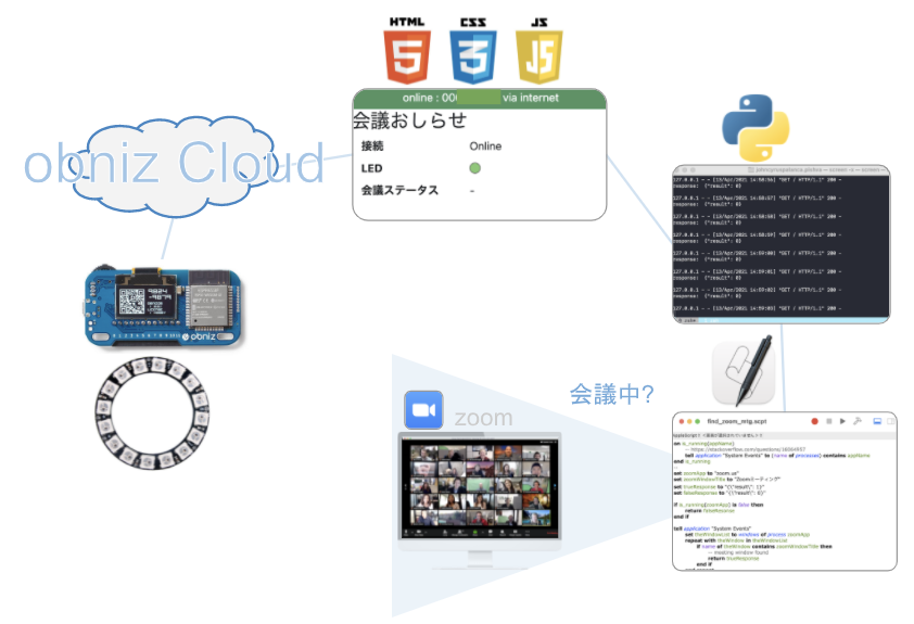 今回はWeb開発の延長線上にデバイスがある魅力を活かし、Webページを中心に以下のような構成になりました。Zoom会議中? を取得するためPythonによる簡易的なWebサーバーとAppleScriptによるZoomのウィンドウの有無の取得を行います。