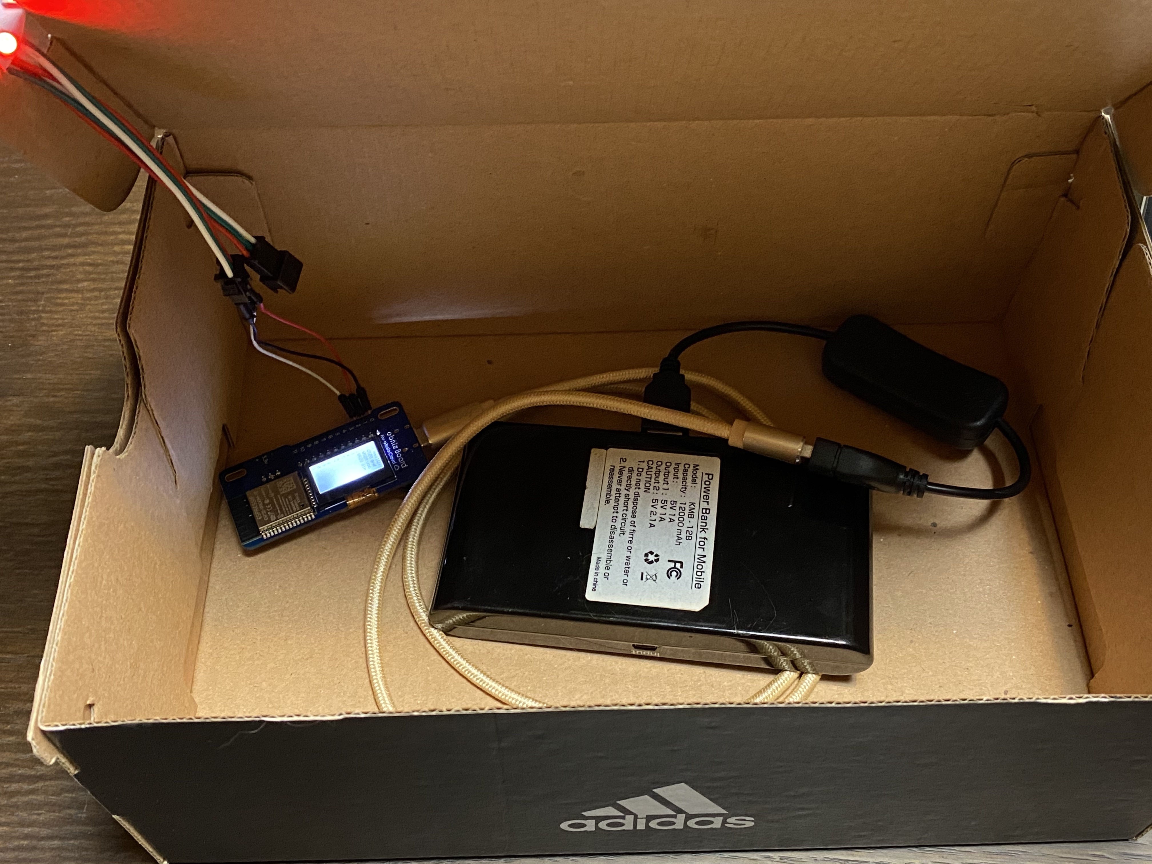 実際の運用では、適当な箱にモバイルバッテリーと共に入れてLEDを見えやすい角度にしています。