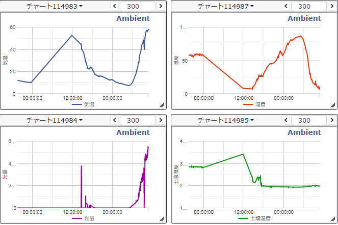 - Ambientの画面からセンサー情報(温度、湿度、光量、土壌湿度)を確認する。