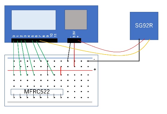 MFRC522の端子は左からSDA,SCK,MOSI,MISO,IRQ,GND,rst,3.3V。