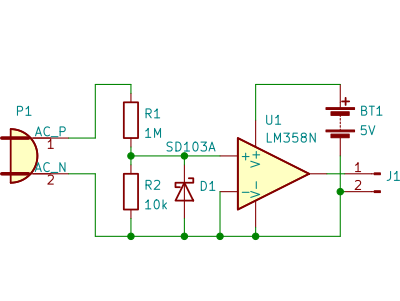 ダイオード D1 はコンパレータの入力端子 V+ への印加電圧を -0.3V に制限するためです。そのために、順方向電圧が低いショットキーバリアダイオードを使います。通常の PN 接合ダイオードを使ってしまうと、V+ に -0.6V 程度が印加されてしまい、オペアンプが壊れます。(何 V まで許容されるかはオペアンプの品種に依存します)