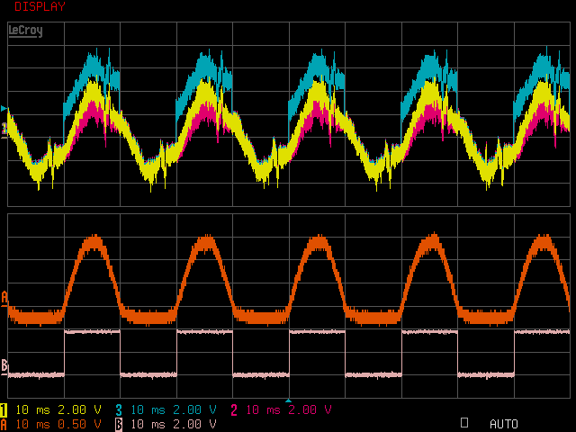 回路図の番号とずれていますが、Ch.3 の水色グラフがコンパレータの出力、Ch.2 の赤色グラフが AC_N の波形です。Ch.1 の黄色グラフは R1 と R2 の中点の電圧を観測したものです。いずれも、オシロスコープのグランド、つまり地表を基準とした電位となっています。