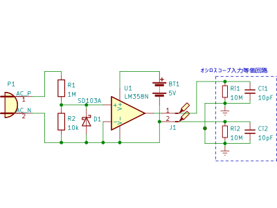 ログインしてコメントを投稿するオシロスコープの話とは関係ないですが、ゼロクロス検出回路に LM358 を使うならヒステリシス回路を追加したほうがいいですね。TI のアプリーケーションノートで使っている TLV7011 はヒステリシス機能が内蔵されているので省略されていると思われます。