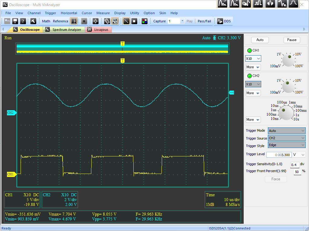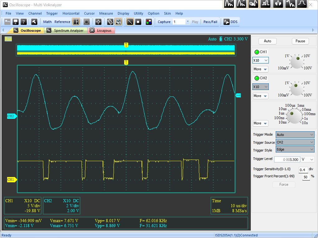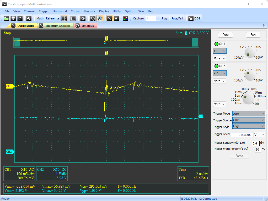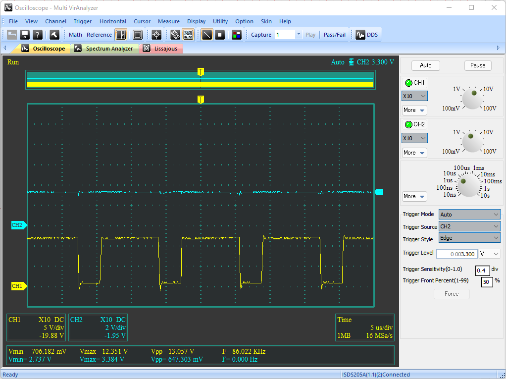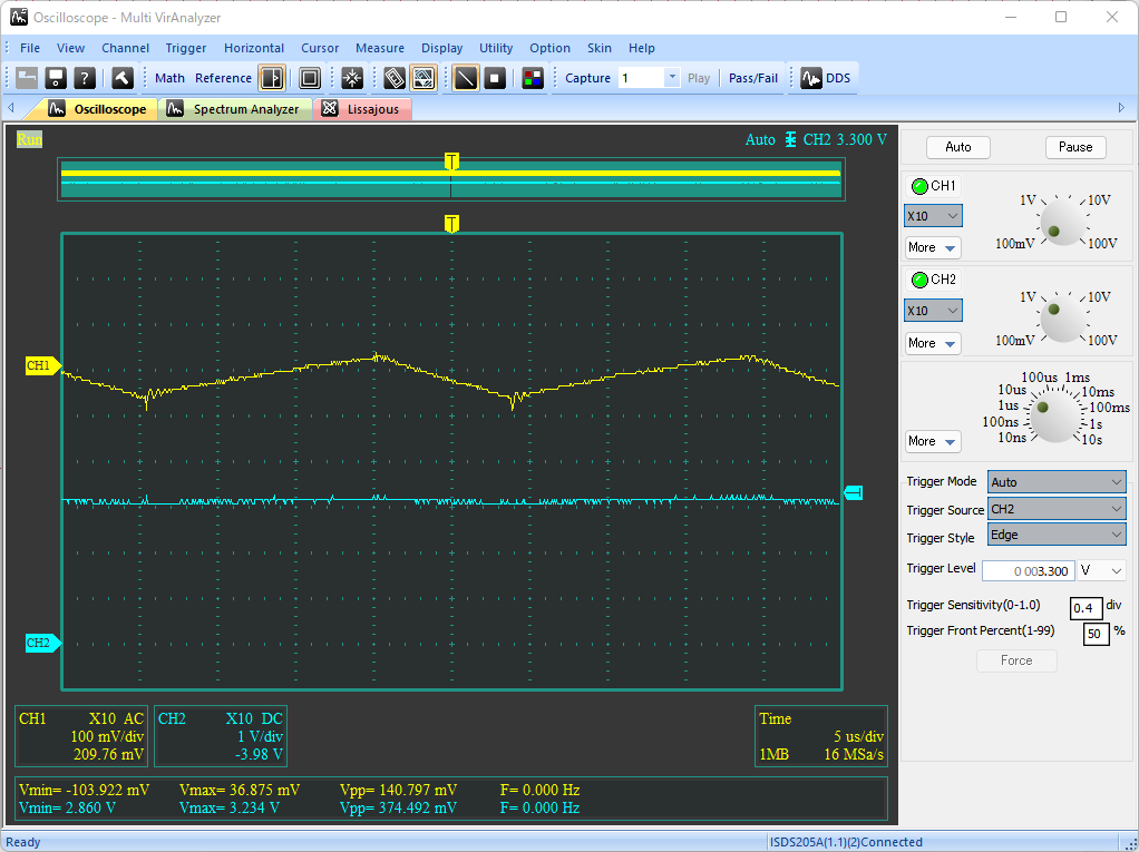 可変抵抗を時計回りに回し切った時、分圧比は1になっているので、出力電圧はVREF電圧、すなわち3.3Vを出力する。この状態から可変抵抗を反時計回りに回していくことで、設定電圧を高くすることができる。ただし、設定電圧が10V前後になると出力電圧が安定しなくなる。さらに、VR1を反時計回りに回し切ると発振は止まり、出力電圧は入力電圧に張り付く。