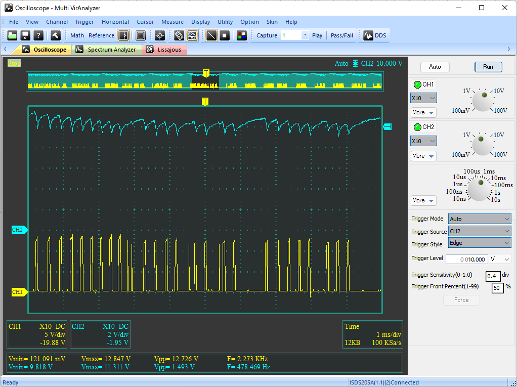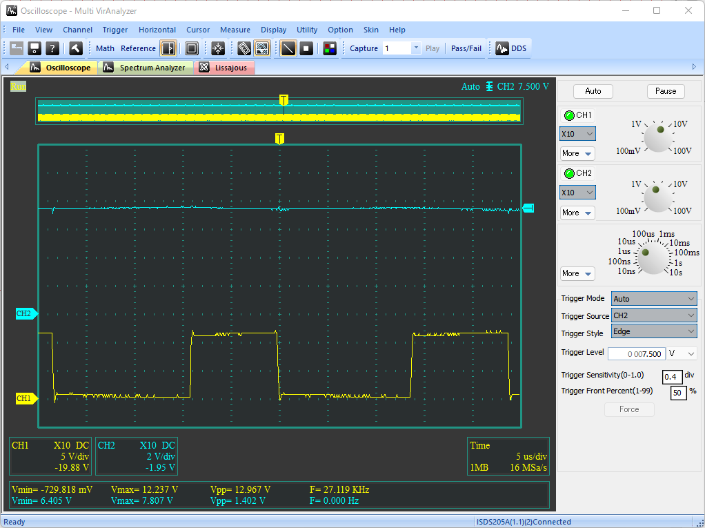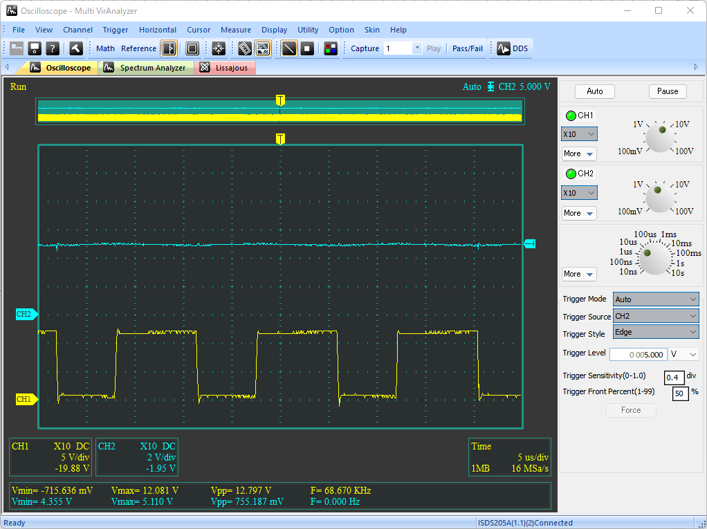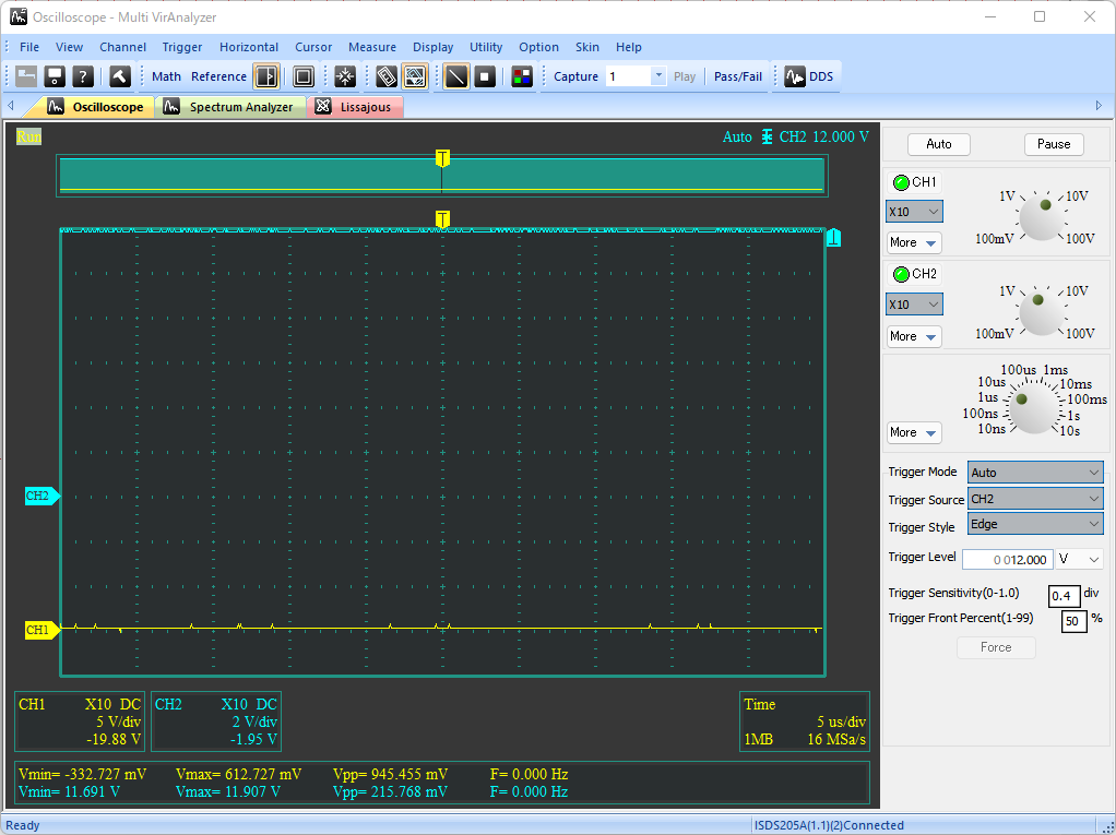 入力電圧VCCを5V, 7.5V, 10V, 12Vに変えたときの出力電圧VOUTの変化を以下に示す(いずれの条件においても、負荷抵抗なし)。いずれの波形も、出力電圧VOUTのDC波形を水色、AC波形を黄色で示している。前回回路では、入力電圧が高くなると出力電圧の変動が著しく大きくなっていたが、今回の回路ではその変動幅がかなり小さく抑えられており、入力電圧の変化に対して出力がより安定していることがわかる。