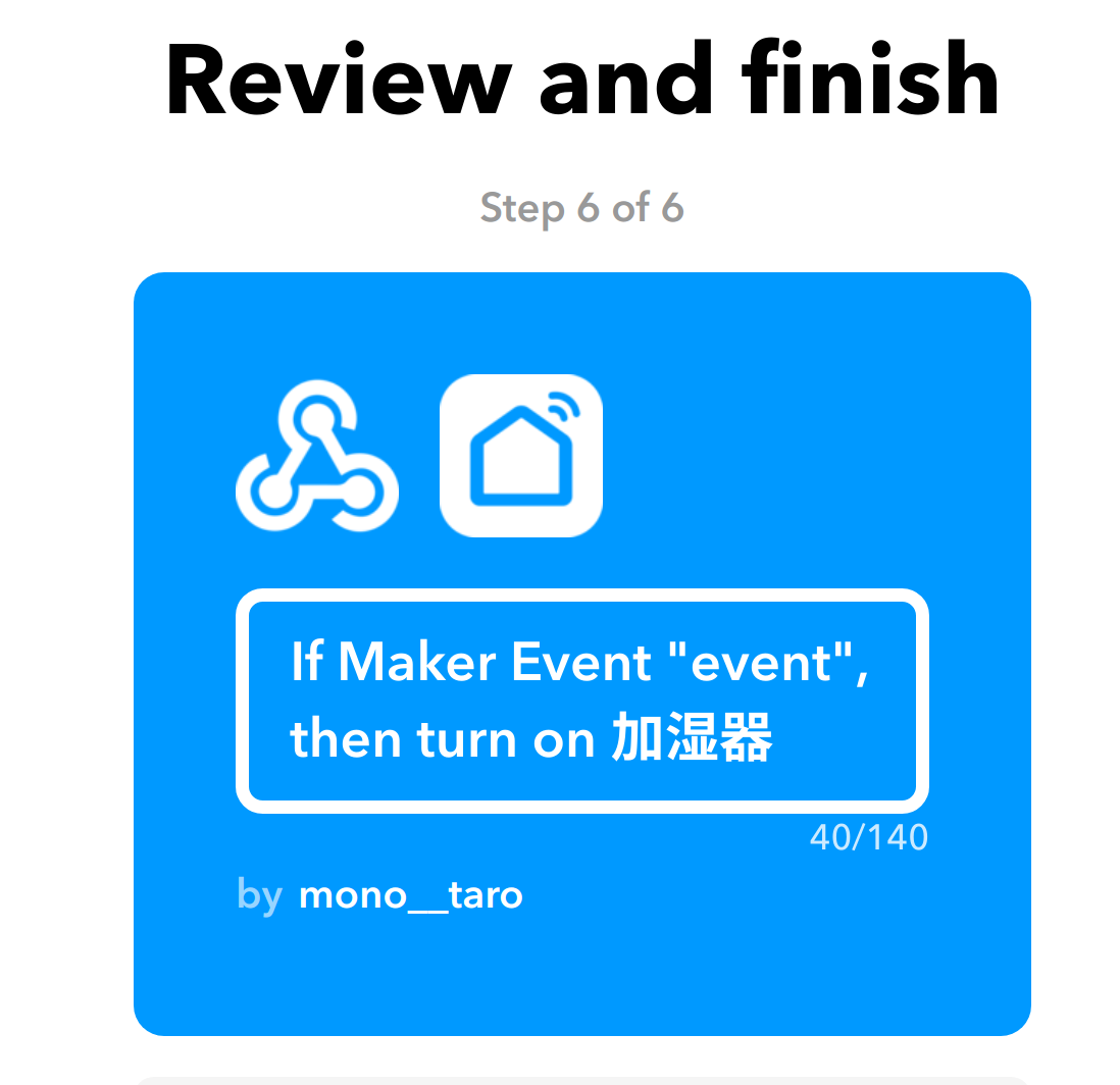 まずiftttでアプレットを2つ作る。(加湿器オン用/オフ用) 作り方はこちらの記事してください。
