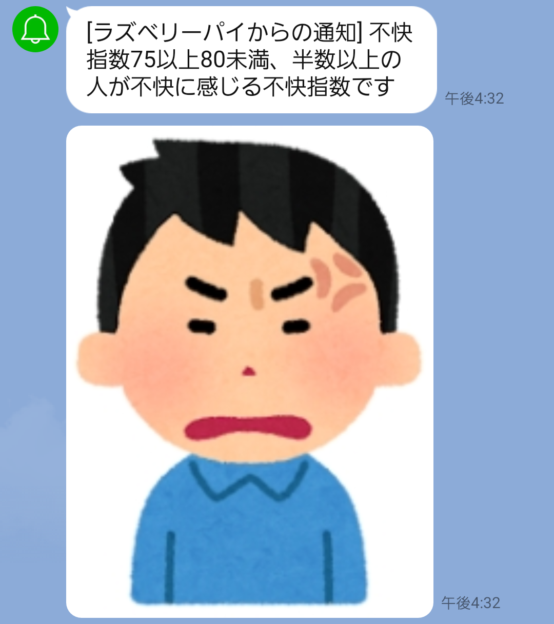 警告の画像の大きさが見やすいサイズで不快指数の段階ごとにわかりやすく送ることができていました。警告のメッセージが短い間隔で連続して送られないようにプログラムの41行目のtime.sleep(10)でプログラムを一定の時間停止させて次の警告までの間隔を長くしています。しかし、実際に生活で使用する場合time.sleep(10)ではまだ次の警告までの間隔が短いと考えました。このことから、自分の生活に合った間隔になるようにプログラムを調整する必要があることが課題です。