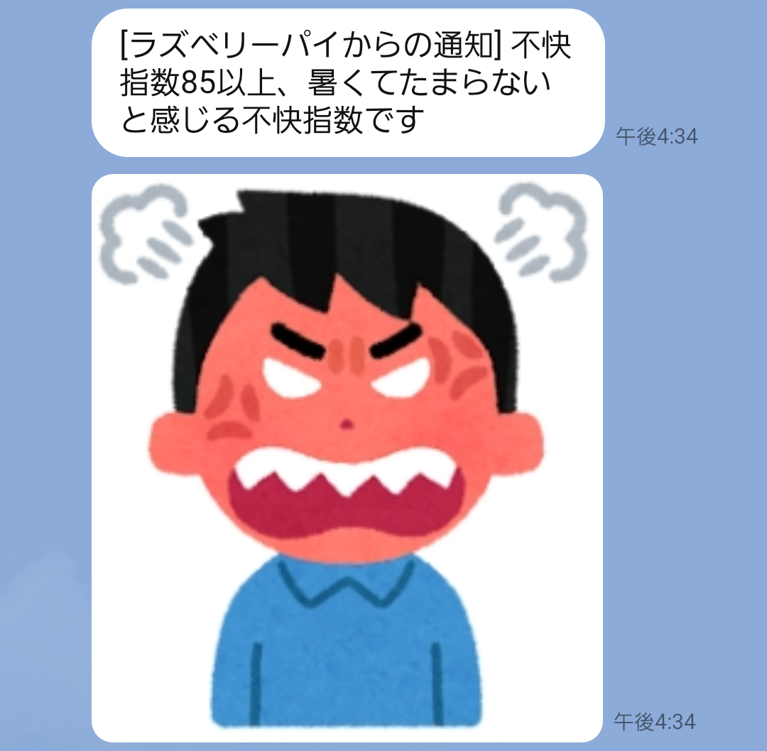 message = "不快指数85以上、暑くてたまらないと感じる不快指数です"