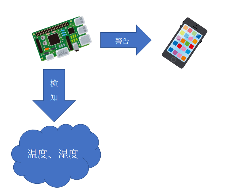 ラズパイ4を使用し、センサーが検知した湿度と温度の値を使って不快指数を計算する。不快指数が75~80、80~85、85以上であったとき、LINE Notifyでスマートフォンに警告を送るシステム。