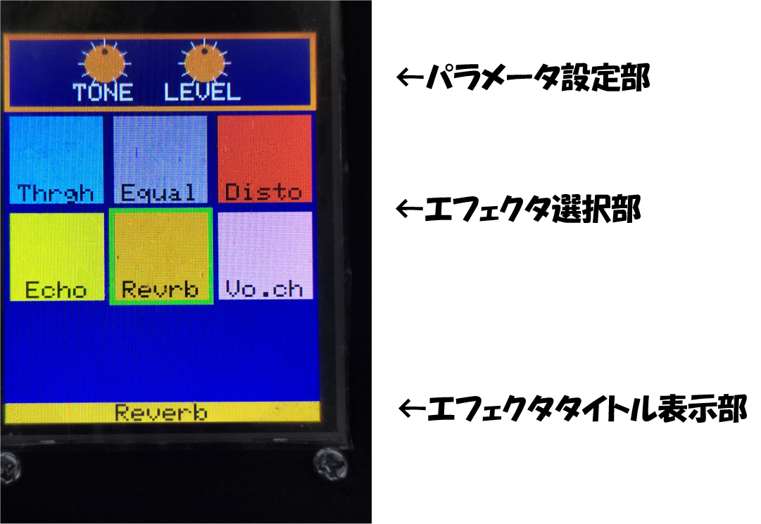 画面は下の写真の様になっていて、上部がパラメータ設定部、中間部にエフェクター選択部、下部分に現在選択されているエフェクタのタイトル表示部という配置となっています。