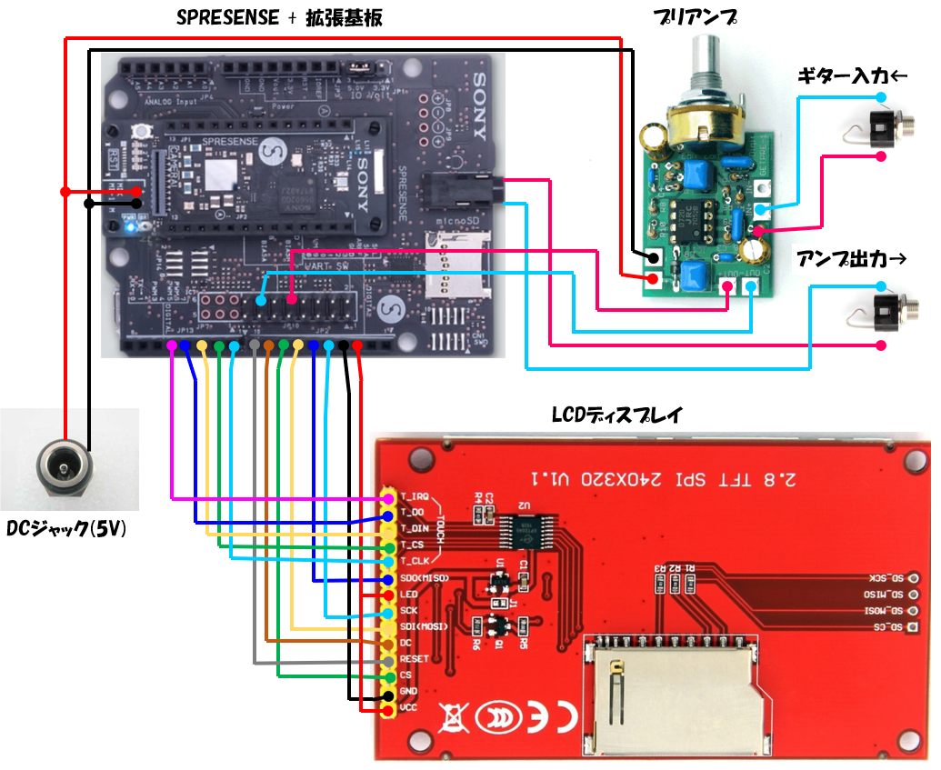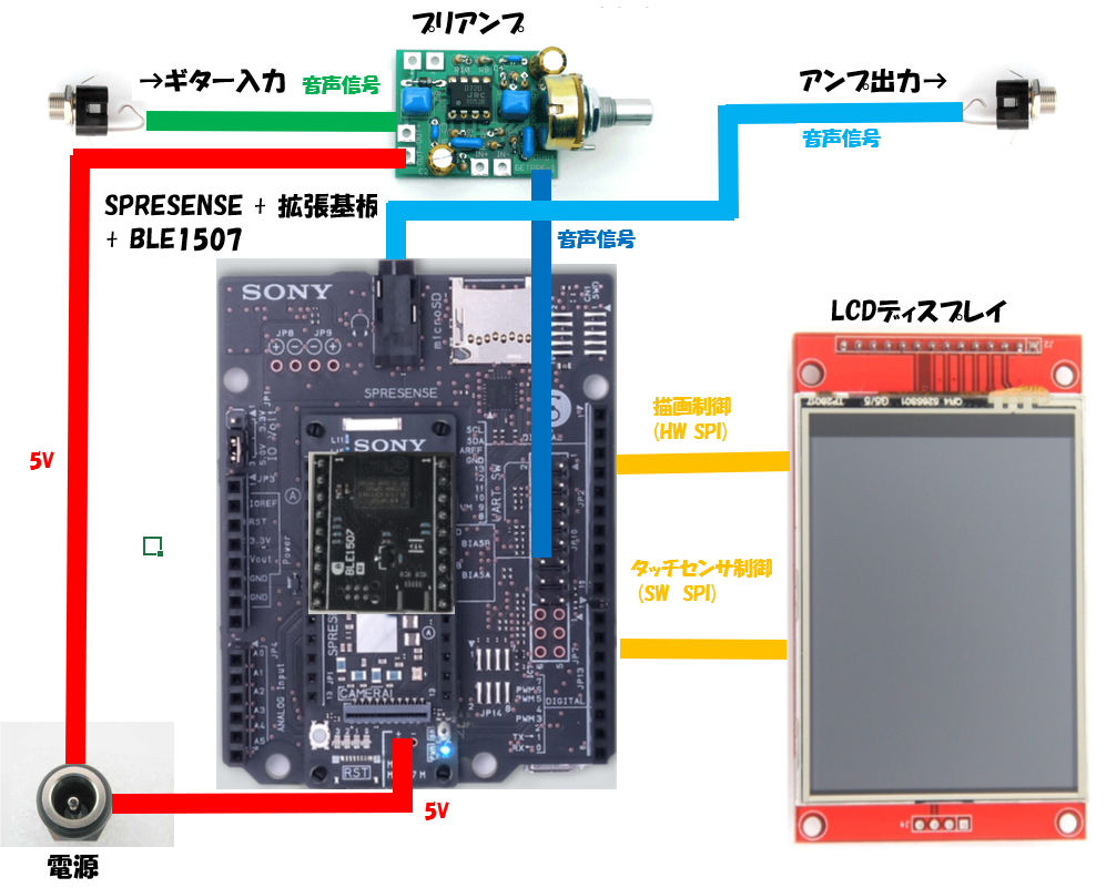 ギターからの入力信号をプリアンプで増幅しながつつSPRESENSE内に取り込み、SPRESENSE内で信号処理をかけてアンプ出力に流すまでの一連の信号の流れです。