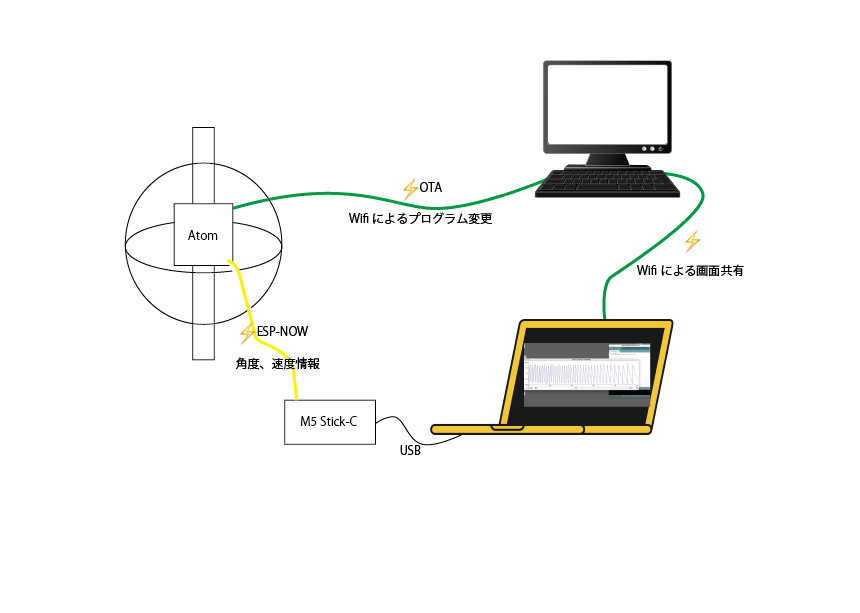 なにせ、ボールの中のAtomは、回転するので、シリアルケーブルを繋げれない。そこで、回転状況の確認に ESP-NOW、プログラムの修正&調整の為に OTAを組込みました。これで、ケーブルを繋がなくても 回転させている状態で、状況モニター、プログラム修正が WiFi経由で出来る様になるはずでした。ところが、ESP-NOWとOTAが共存できませんでした。色々解決策を模索しましたが、時間切れでした。ESP-NOWは状態確認のさいにだけ使うのでとりあえず OTAを組込んで開発しています。