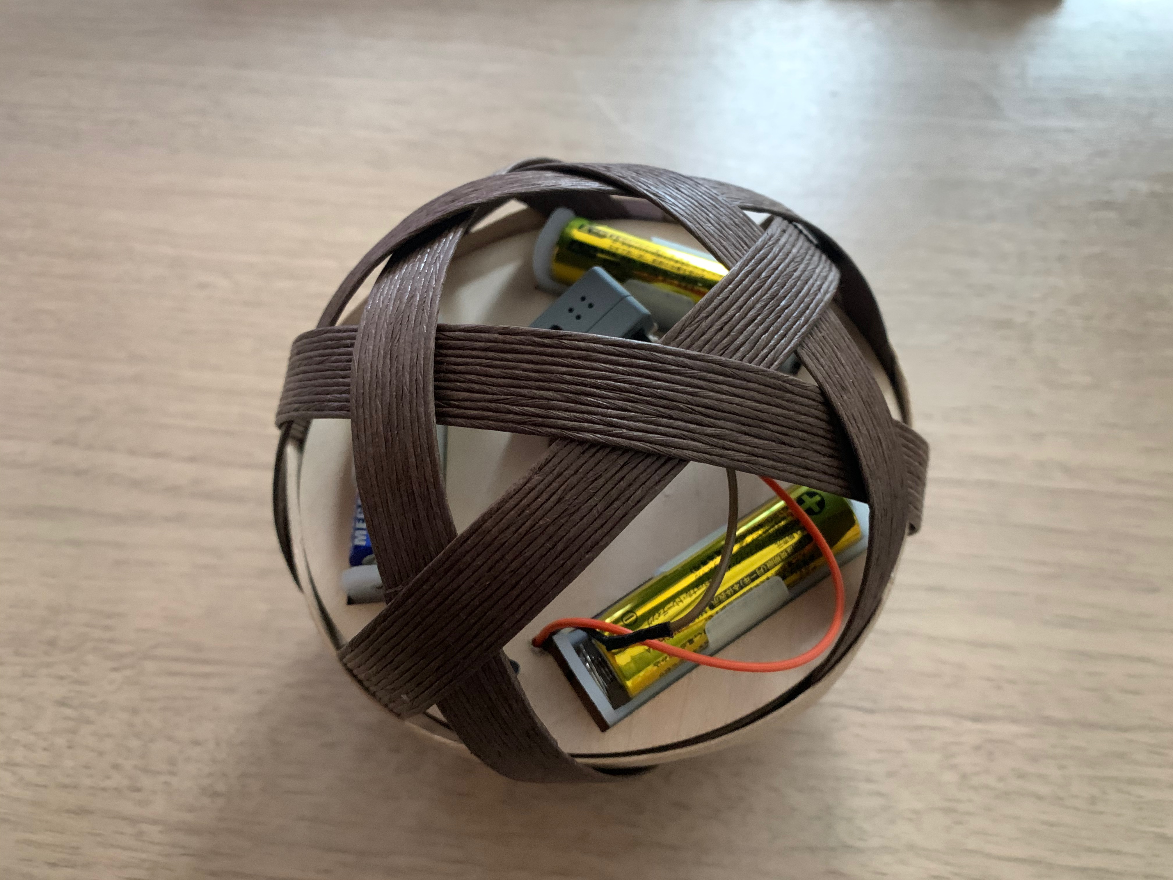 それを、百円ショップの紙テープで編んで作成しました。なぜこれを選んだかと言うと、あまりガチガチの機構にしたくなかった為です。中空のボールに電子系、電池を入れてまともに動くものを真面目に制作するとかなりの手間になって、かつ変更が大変になります。この編物だと、編んだ後から色々物を入れれるし、外からアクセスもしやすい。電池交換も外からアクセスして簡単に出来ます。要は手を抜きたかったと言うことです。