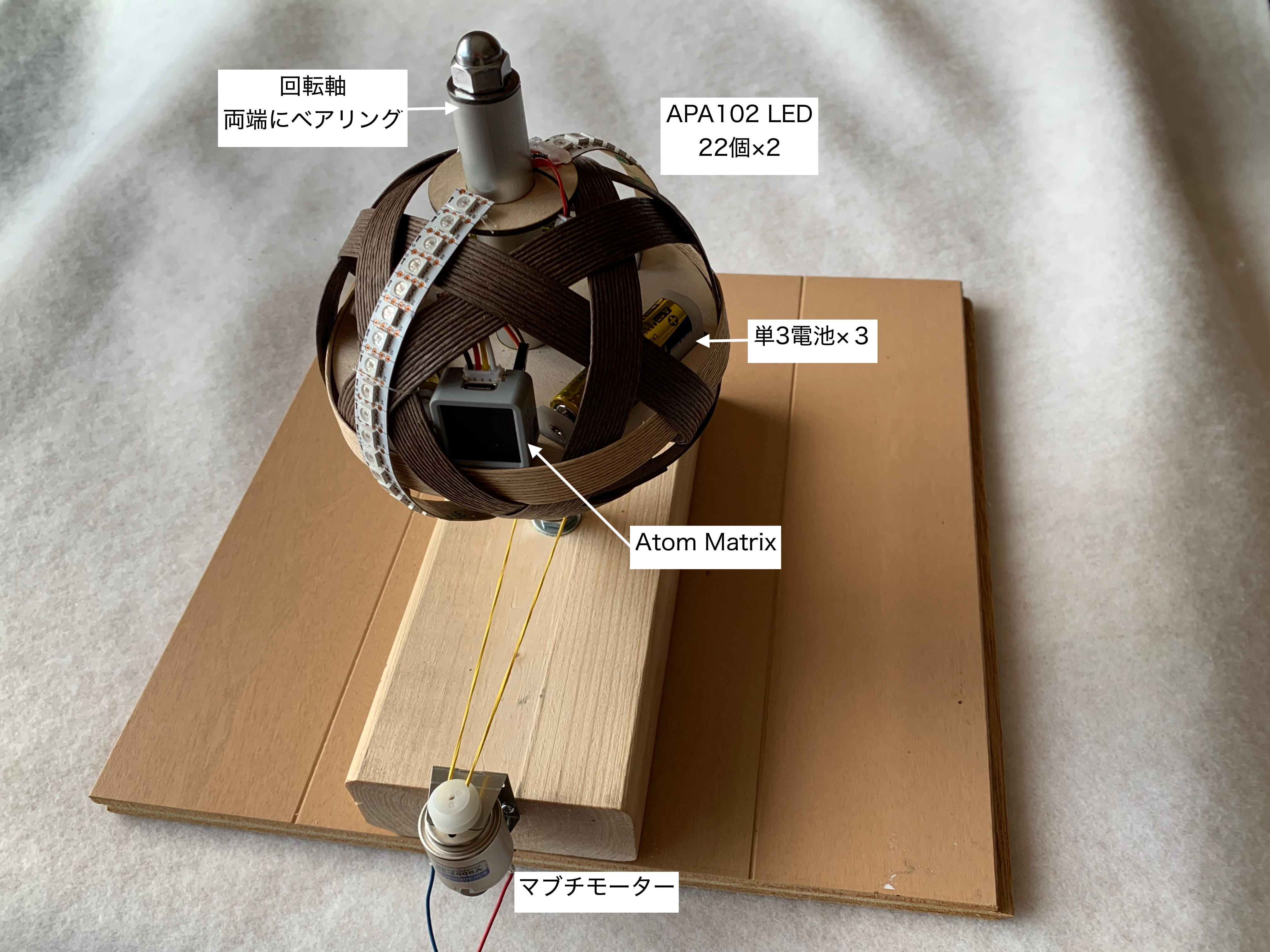 回転するボールの外側にテープLEDを配置して、回転により 残像表示をします。(Povとも、バーサライタとも呼びます)