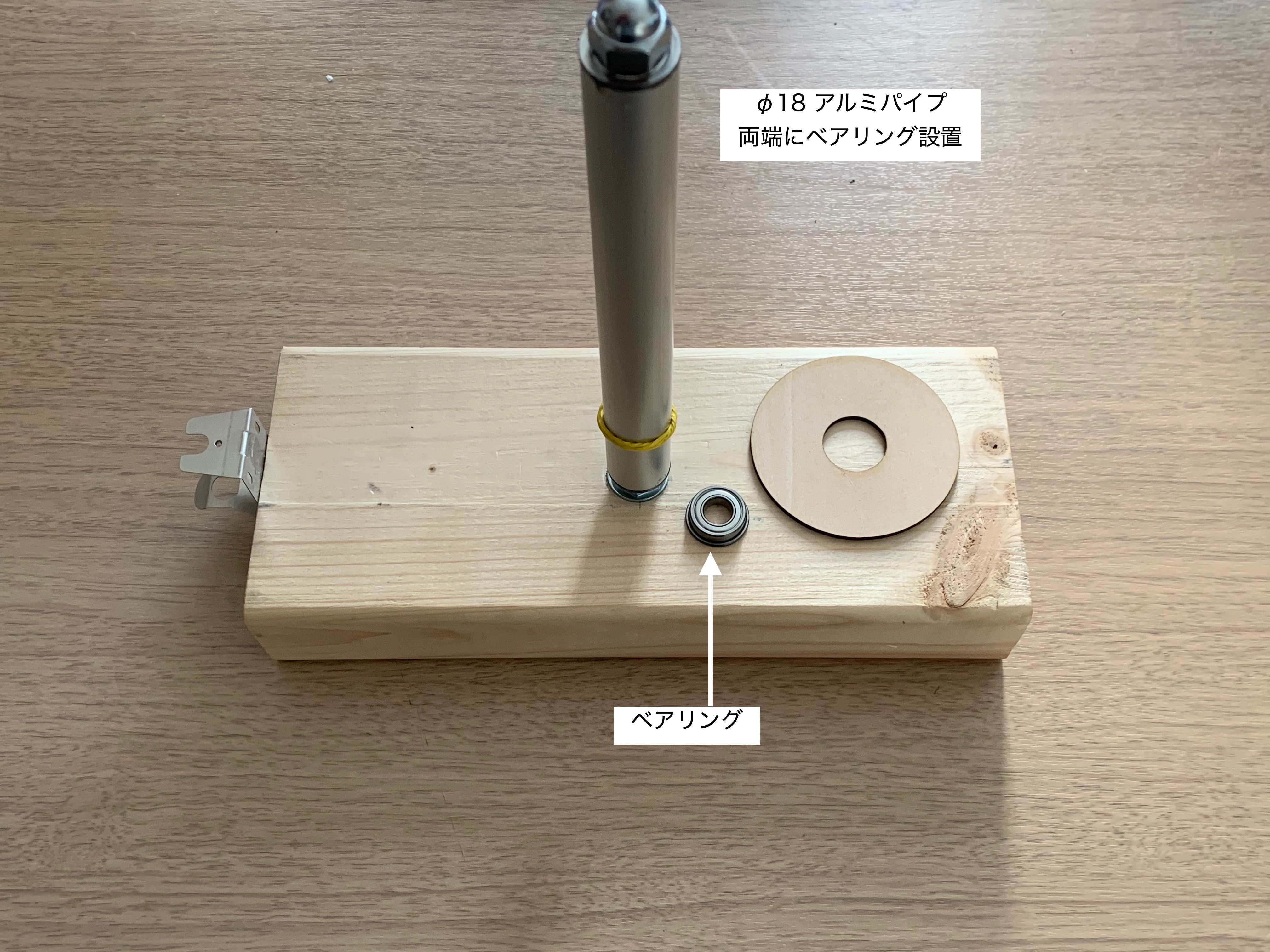アルミパイプ両端にベアリングを設置、それを台座に取り付けます。