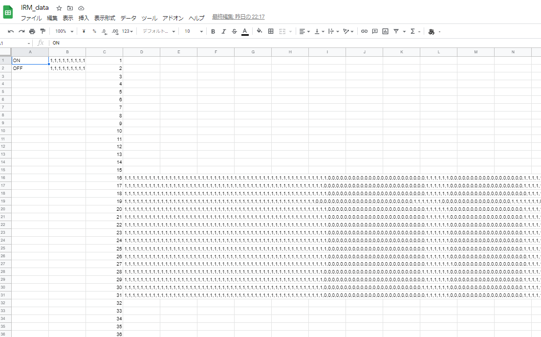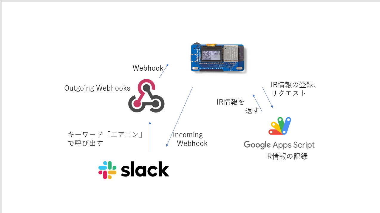 まずSlackからどのようにエアコンを操作するのかを説明します。まずSlackで「エアコン」というキーワードを送信するとOutgoing Webhooksに検知され、obnizのWebhookをたたきます。このWebhookの設定の仕方はこちらで説明されています。次に、赤外線情報を得るためにGoogle Apps ScriptにPOSTリクエストを送ります。するとGoogle Apps Scriptは事前にGoogleスプレッドシートに記録していた赤外線情報を返します。