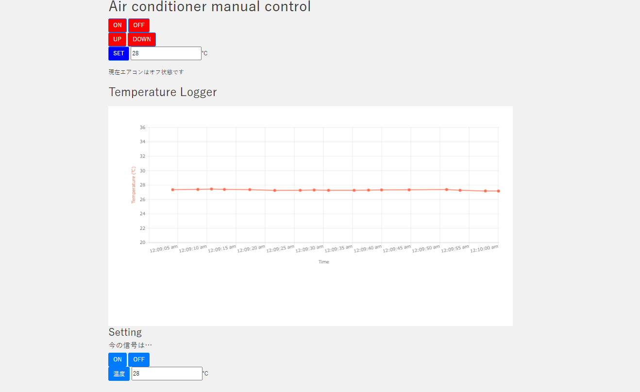 運用としては、部屋の大体の温度を計測した後、暑いなと思ったらリモートでエアコンのスイッチをオンにするということを想定しています。
