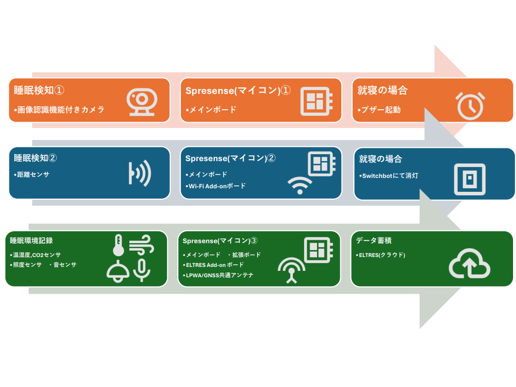 取得したセンサデータはSpresense上で統合・判定処理を行い、Wi-Fi Add-on Boardを介してクラウド(ELTRES)へ送信・蓄積する構成とした。さらに、Spresense Camera Boardで撮影した画像を用い、Neural Network Consoleで学習させた画像認識モデルにより人物の有無や姿勢を判別し、机での伏せ寝など睡眠にとって不適切な状態を検知する。画像認識の結果に基づき、望ましくない環境での睡眠が検知された場合には、SpresenseのGPIO出力を用いてブザーを起動し、利用者を起床させる。望ましい環境での睡眠を検知された際にはSwitchbotと連携し部屋の電気を消灯させる。