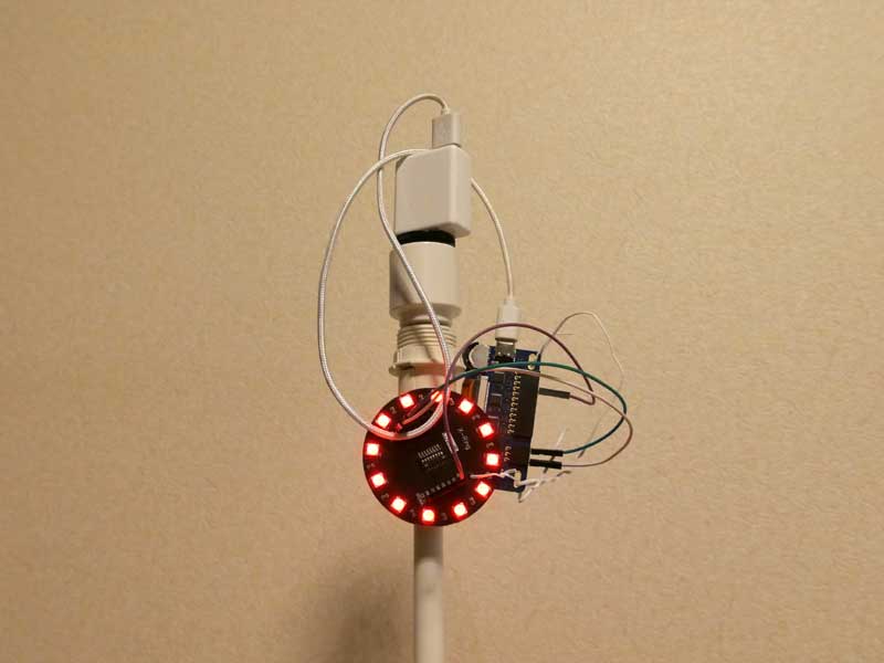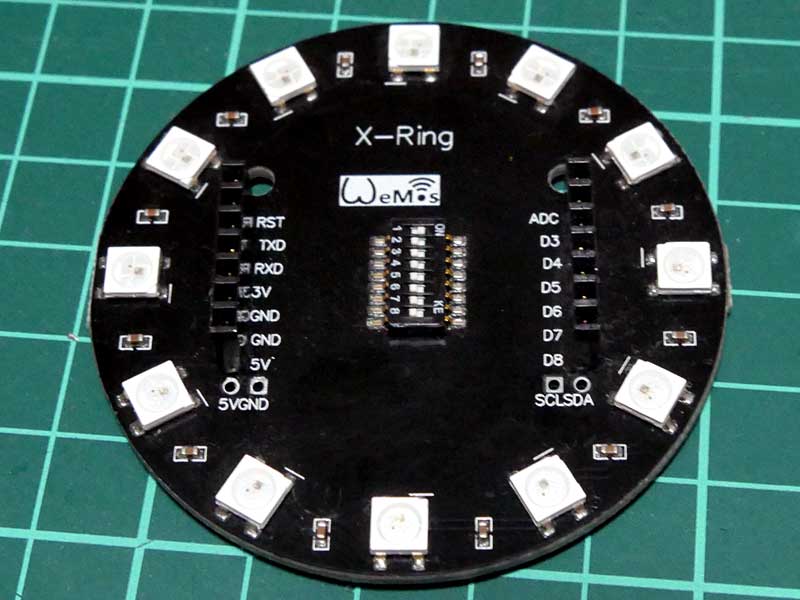 今回使用したカラーLEDは、Wemos X-Ringという12個のカラーLEDがリング状に配置された製品。配線用のピンソケットをはんだ付けして使います。テープLEDなら、はんだづけなしで使えるので、手軽に試したい方はそれでもOKです。
