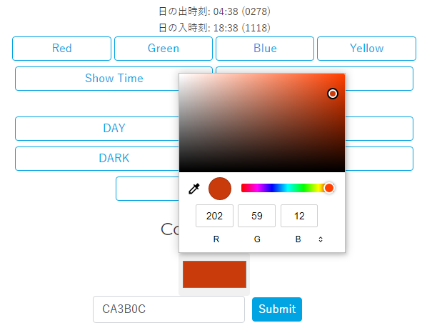 ボタンで表示する色、時間帯に合わせた色は、JavaScirptオブジェクトcolorsで定義しています。もっと細かく時間を分けたい場合は適宜増やしてください(時刻を判定する部分も修正が必要です)。