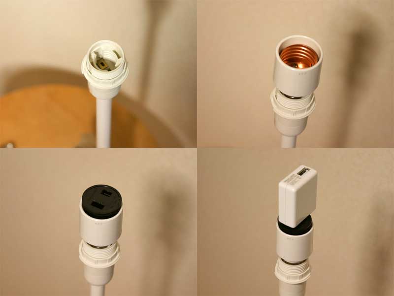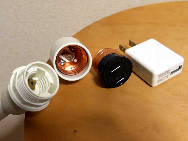 今回使用した照明スタンドは、電源コードはついているのですが、出力はE17という電球を付けるためのソケットになっています。そのままでは当然USBに出力できません。