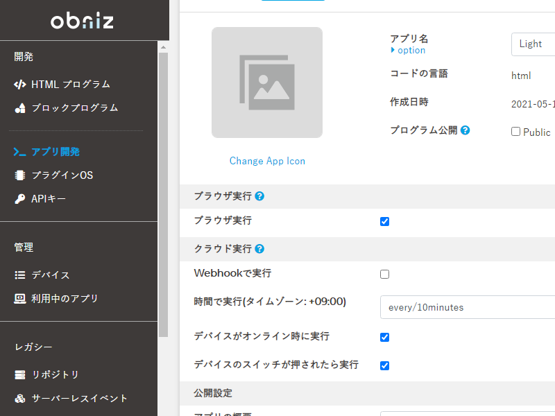 「アプリ開発」の一覧で、先に書いたプログラムの「アプリ設定」を開き、「ブラウザ実行」をチェック、さらに「クラウド実行」の以下の項目を設定します。