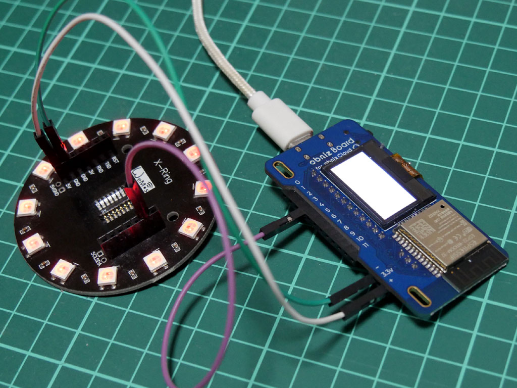 今回、obniz側は5V電源出力の「+」とGNDの「-」、信号用「io3」のピンを使用(信号用は任意)。X-Ring側はそれぞれ5V、GND、D3につなぎました。上の写真を見ればわかるかと思います。