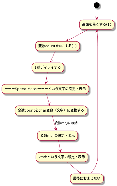 チャートには示しませんでしたが、パルスが入った際に割り込みを掛け、変数countをカウントしています。1秒の間に何回カウントできたかによって、時速が分かるのです。