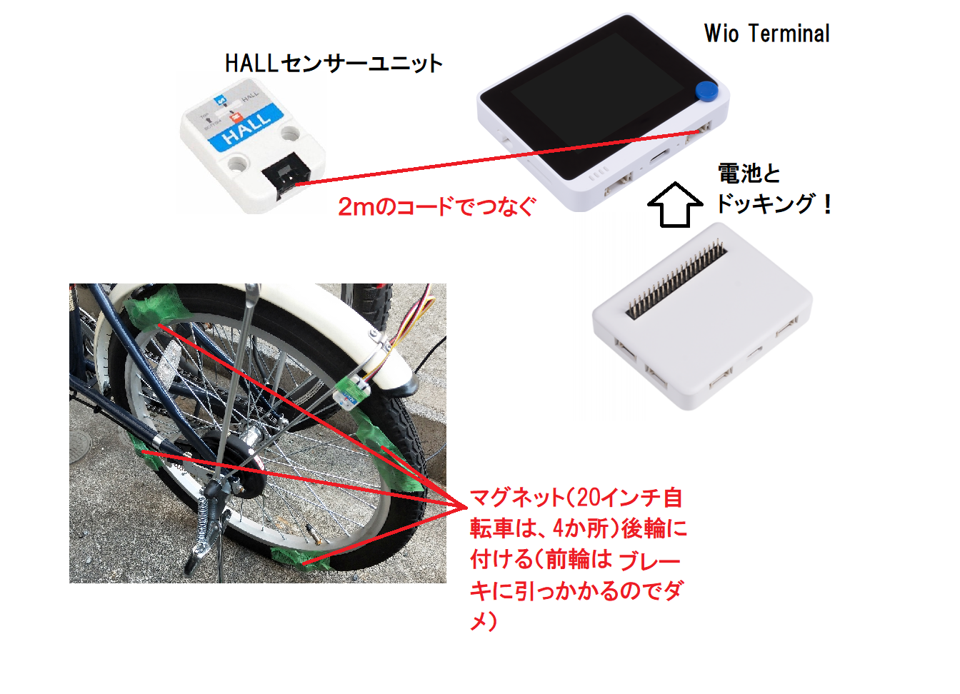 ただ、ホールセンサー付属のコードでは短すぎて、ハンドルのある前まで届かないので、200cmものの長さの長~いケーブルを使いました(意外とあるものですね