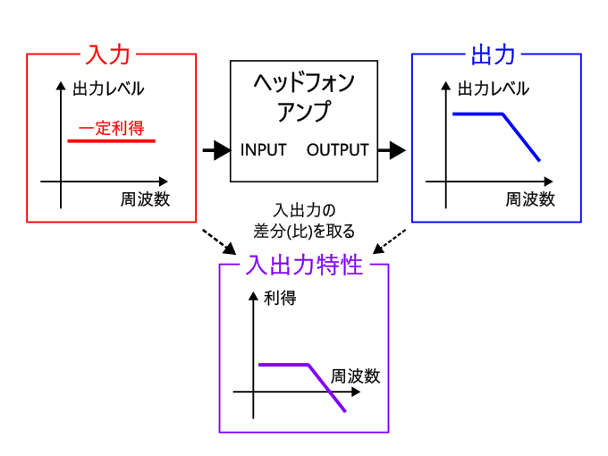 このため、「すべての音は正弦波の組み合わせでできている」ことを逆手に取り、「すべての周波数帯の正弦波が均一に合わさることでできる音」を音源としてアンプに入力し、その出力の周波数特性を取る、という方法が昔からとられている。例えばヘッドホンアンプの利得の周波数特性を見る場合は下図のように、どの周波数帯においても出力レベルが一定になる信号を入力し、出力波形から各周波数に対する出力レベルを取得する。そして、入出力の出力レベルの差分(利得の場合は比)を取ることで、利得の周波数特性を求めることができる。(説明は省くが、位相差の周波数特性に関しても同様に測定できる。)
