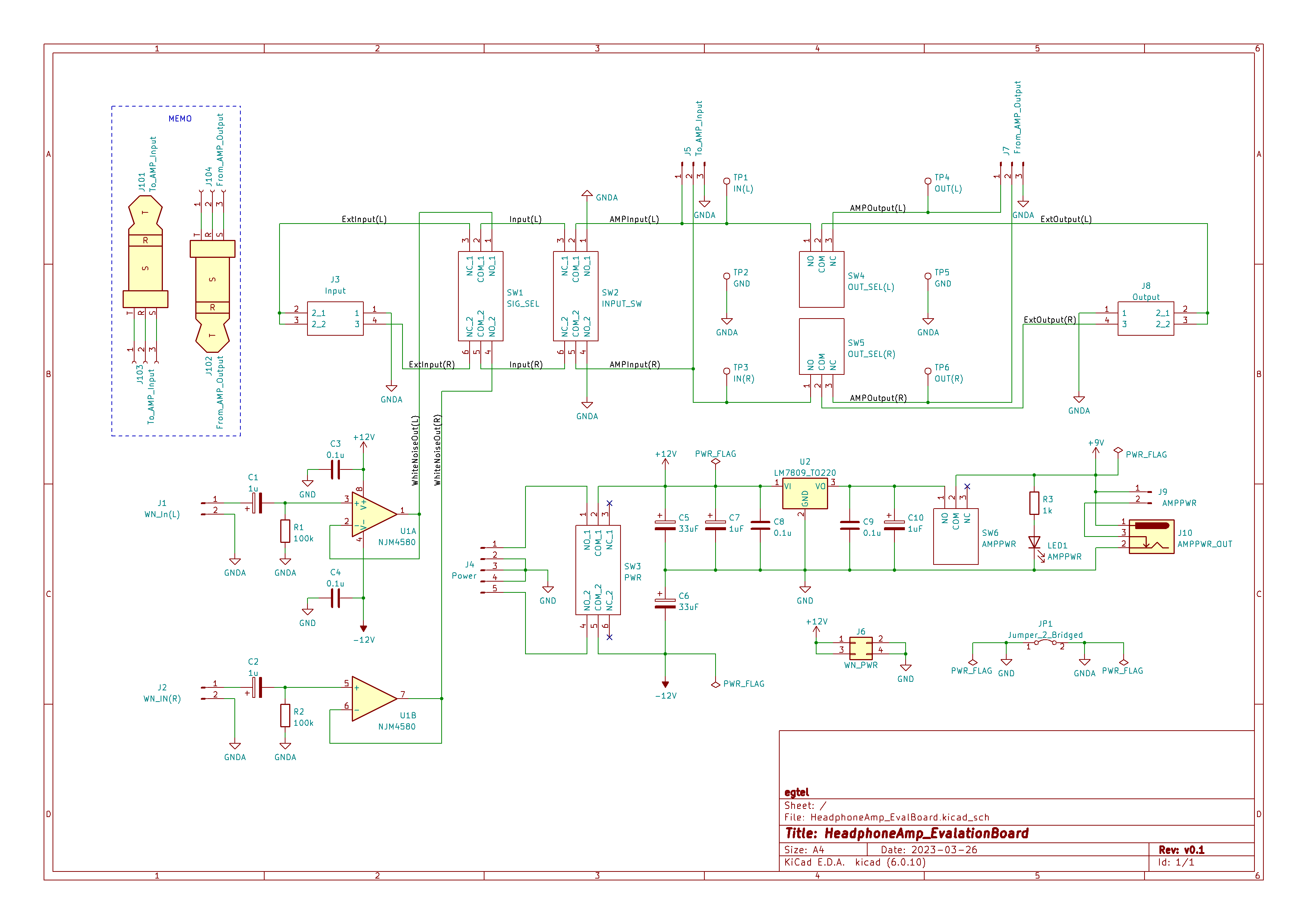 上記の意図2は、ステレオジャックに音源を接続しておき、SW1で入力ソースをホワイトノイズ発生器と切り替えることで実現できる。また、意図3については、オペアンプのつけ外しを行う際、ヘッドホンアンプの電源を切った後にアンプ入力に信号が入ってくることにより、オペアンプを破壊する可能性があることを懸念している。これに対しては、ヘッドホンアンプの電源をOFFにする前にSW2をGND側に倒しておくことで簡単に防止できる。