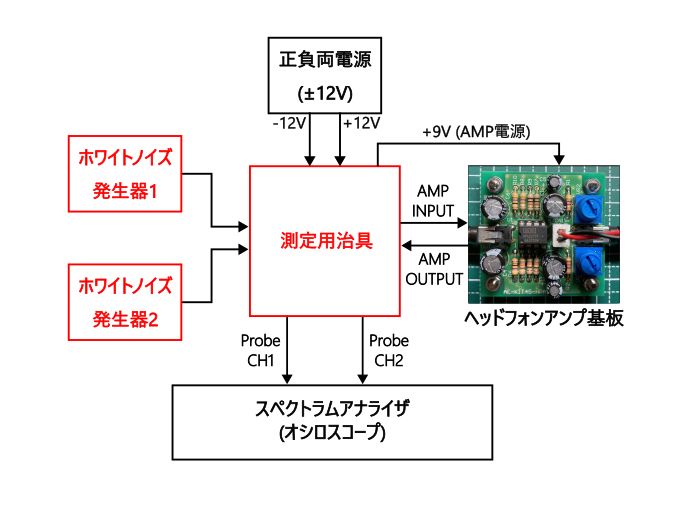 測定対象のヘッドホンアンプに加え、上記をそろえることで周波数特性を測定することができるが、今回は測定時におけるオペアンプ交換時や、性能測定の合間に実際のヘッドホンアンプとして音楽鑑賞する時の利便性を考慮して測定治具を作成し、下図のような測定システムを構築した。次節では、下図の赤枠部分について説明していきたい。