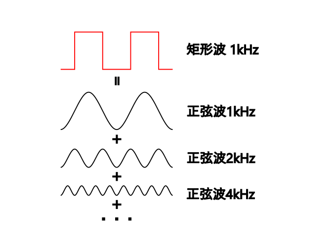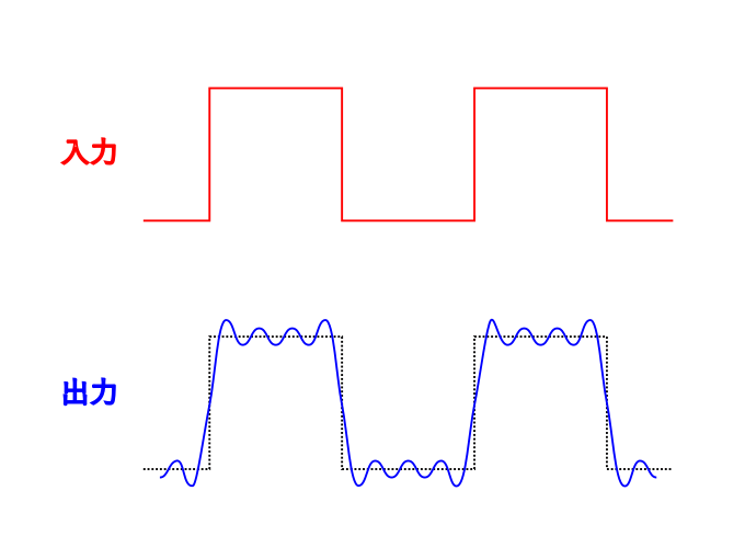 例えば図1で説明した矩形波を構成する正弦波のうち、下から3番目までの周波数のものしかならない場合、その波形は元のカクカクした波形とは大きく異なり、図2のような正弦波のような波形に近づく。もちろん、4番目以降もちゃんと鳴らせるアンプの場合、この矩形波はより音源の音に近づけて鳴らすことができる。