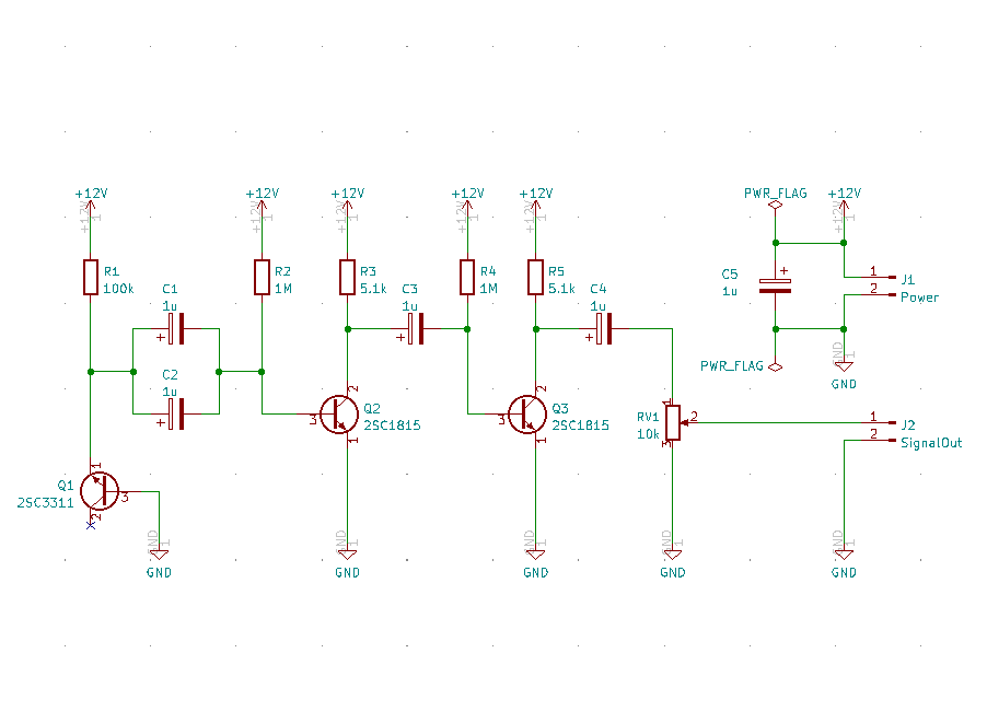 電子回路でのホワイトノイズ発生方法についてはいくつかあるが、今回はバイポーラトランジスタの降伏現象(ツェナー降伏)を利用したホワイトノイズ発生器を作成した。ツェナー降伏とは、PN接合(ダイオード)にかける逆方向電圧を上げていったとき、それまで電流を流さなかったダイオードが急に電流を流し始める現象のことである。このツェナー降伏の際に流れる電流には多くのノイズが含まれ、それがホワイトノイズであることがよく知られている。市販のデバイスで、このツェナー降伏を起こしやすいのがバイポーラトランジスタとツェナーダイオードである。個人的所感として、ホワイトノイズ発生器の制作には前者のバイポーラトランジスタを使用している例が多かったので(例えばこちらなど)、今回の制作でもそれに倣った設計を行った。